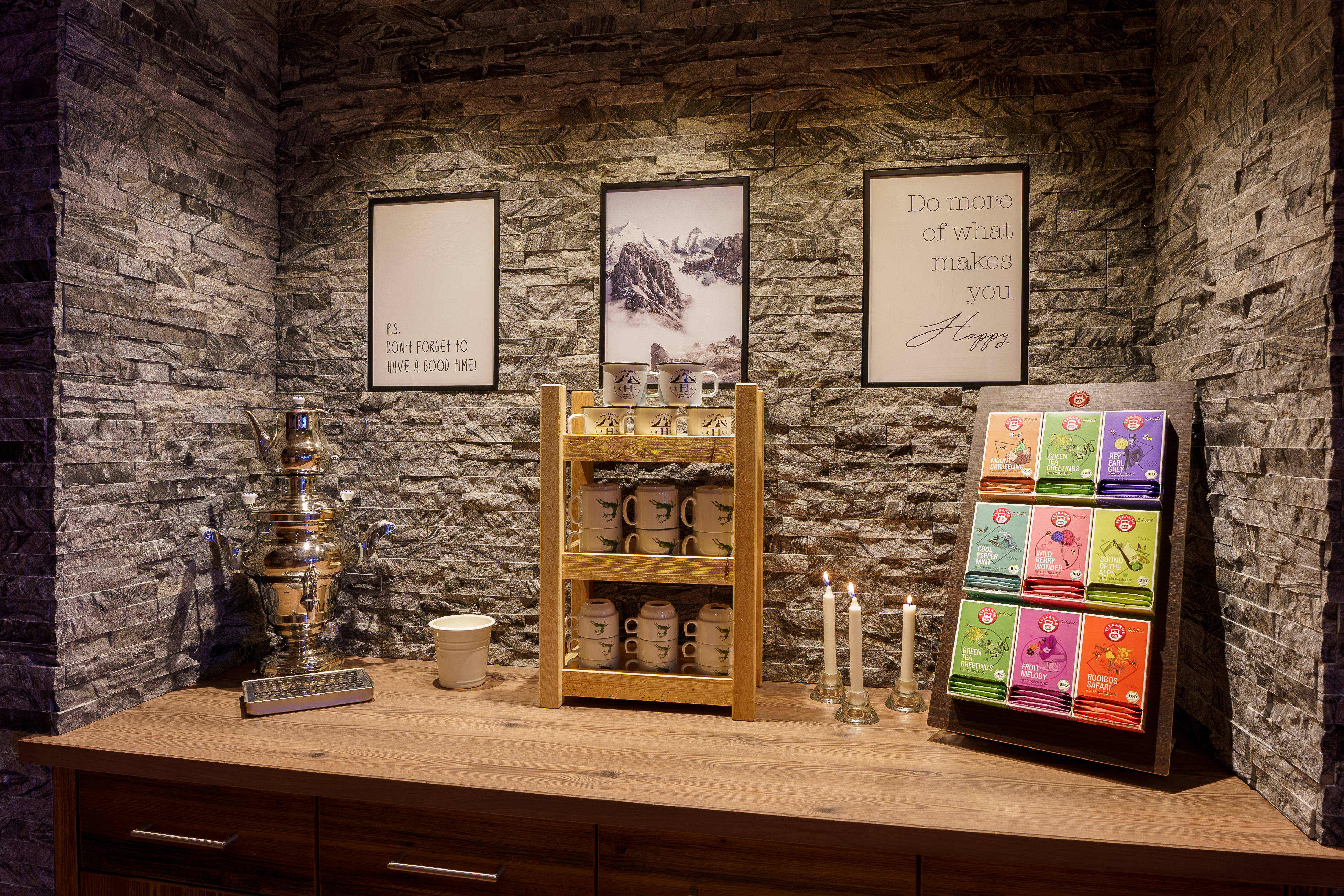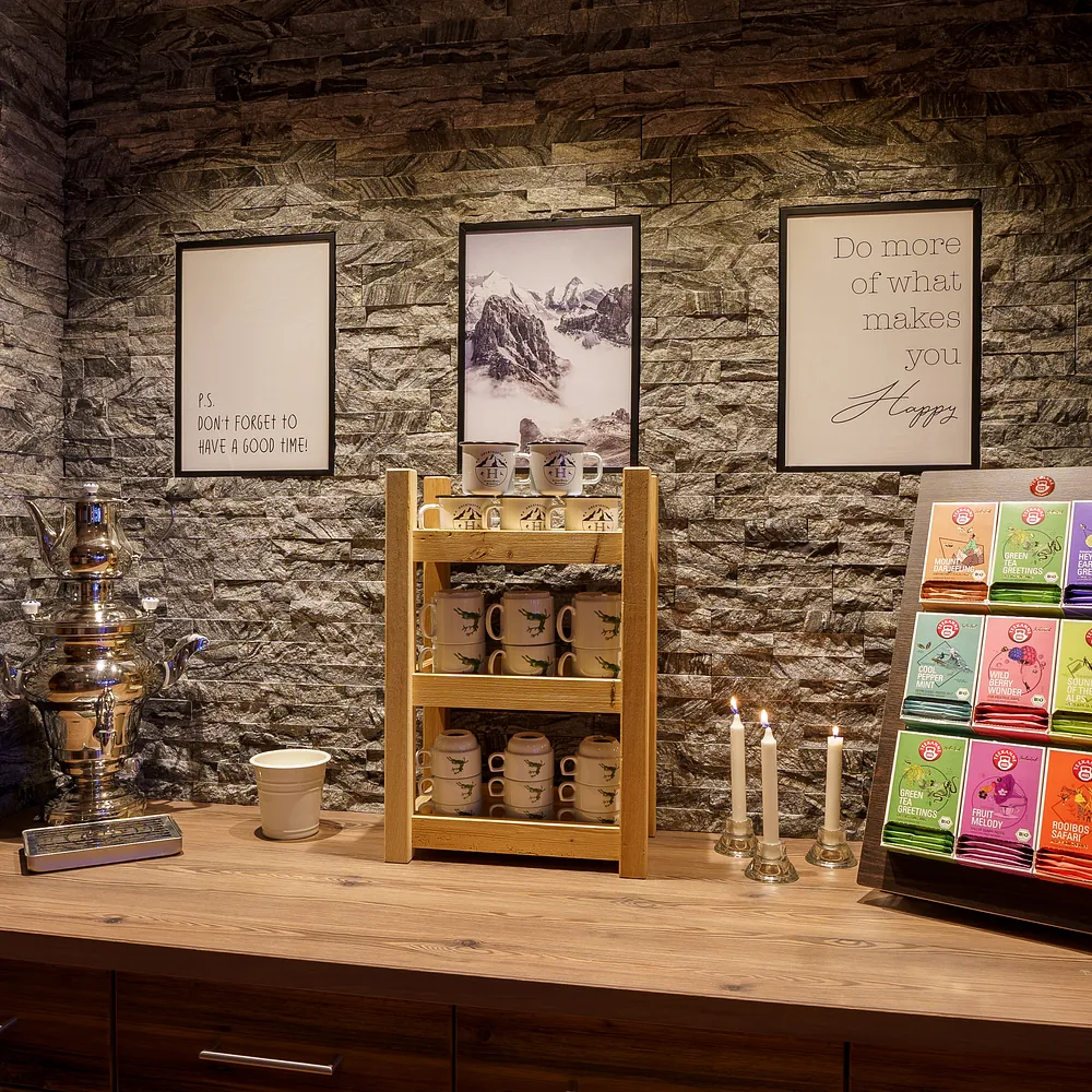 Ob nach einem aktiven Tag auf der Piste, Wanderwegen oder dem Mountainbike oder ganz einfach zum Relaxen – unser Kaminzimmer mit einladender Teenische ist der ideale Ort, um bei gemütlich prasselndem Feuer und wohliger Wärme ein gutes Buch zu lesen, eine Tasse Tee zu genießen oder einfach entspannt in die Flammen zu schauen. Nehmen Sie die entspannte Atmosphäre in sich auf und tanken Sie neue Kraft für Ihren Alltag!